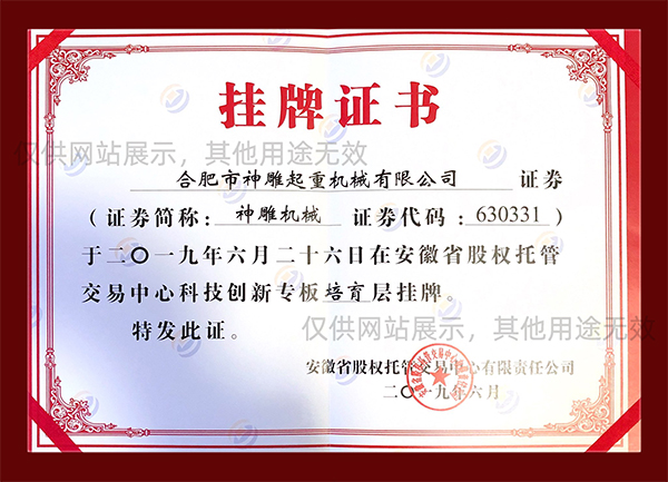 合肥神雕起重是高新技術企業,是安徽省科創板掛牌企業(證券代碼:630331),同時榮獲安徽市場質量、誠信五星級企業、合肥經濟圈示范企業、合肥市創新型企業、安徽省市場質量放心產品等榮譽稱號